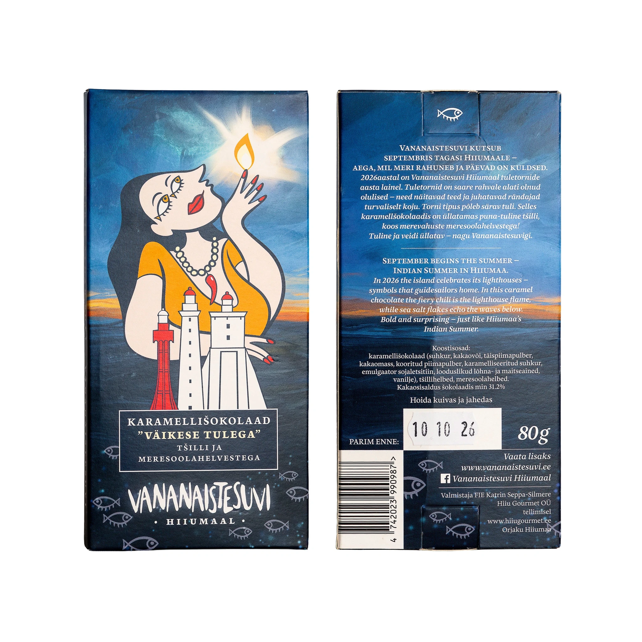 In 2026 the island celebratesits lighthouses - symbols that guidesailors home. In this caramel choclate the fiery chili is the lighthouse flame, while sea salt flakes echo the waves below. Bold and suprising - just like Hiiumaa's Indian Summer.