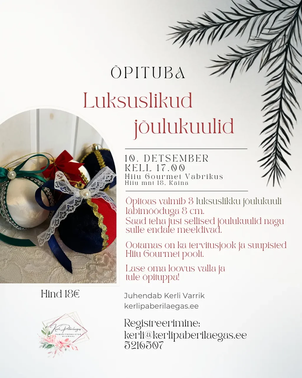 Registreerimine: kerli@kerlipaberilaegas.ee, tel 5216507